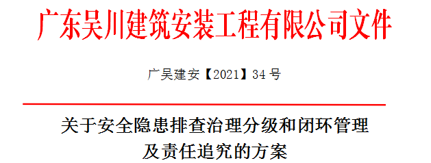 為建立安全隱患排查治理長效機(jī)制,強(qiáng)化安全生產(chǎn)主體責(zé)任,加強(qiáng)安全隱患治理,防止和杜絕事故發(fā)生,保障施工項(xiàng)目的安全生產(chǎn),現(xiàn)結(jié)合公司的實(shí)際,特制定安全隱患排查治理分級和閉環(huán)管理及責(zé)任追究的方案。