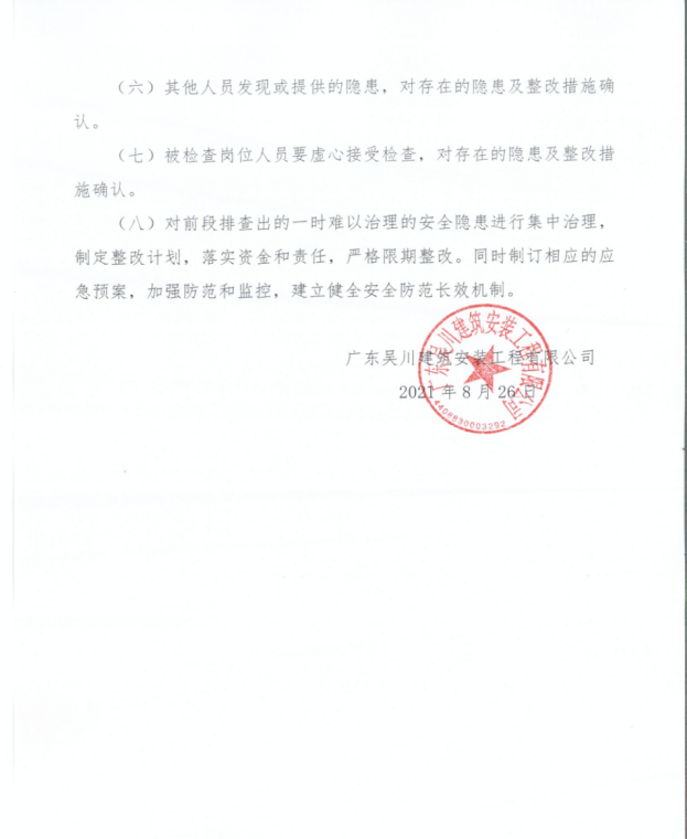 (二)、項(xiàng)目部對排查出重大安全隱患,應(yīng)及時(shí)向分公司和公司技術(shù)質(zhì)安部報(bào)告。重大安全隱患報(bào)告內(nèi)容應(yīng)當(dāng)包括:隱患的現(xiàn)狀及其產(chǎn)生的原因,隱患的危害程度和整改的難易程度分析, 隱患整改的治理方案。