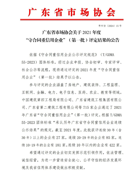 近日,廣東省市場(chǎng)協(xié)會(huì)發(fā)布了2021年度“守合同重信用企業(yè)”(第一批)評(píng)定結(jié)果,我公司榮耀再續(xù),連續(xù)三十五年“廣東省守合同重信用企業(yè)”稱號(hào)。獲得此榮譽(yù),不僅對(duì)公司實(shí)力的認(rèn)可,更是對(duì)誠(chéng)信經(jīng)營(yíng)和優(yōu)質(zhì)服務(wù)的肯定。