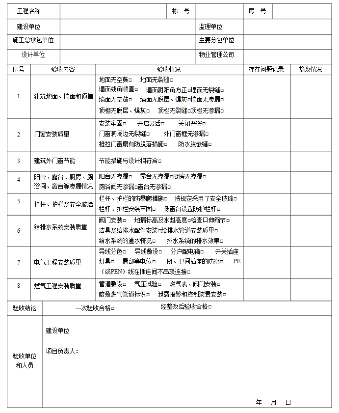 住宅工程分戶驗收觀感質(zhì)量檢查驗收表填寫說明